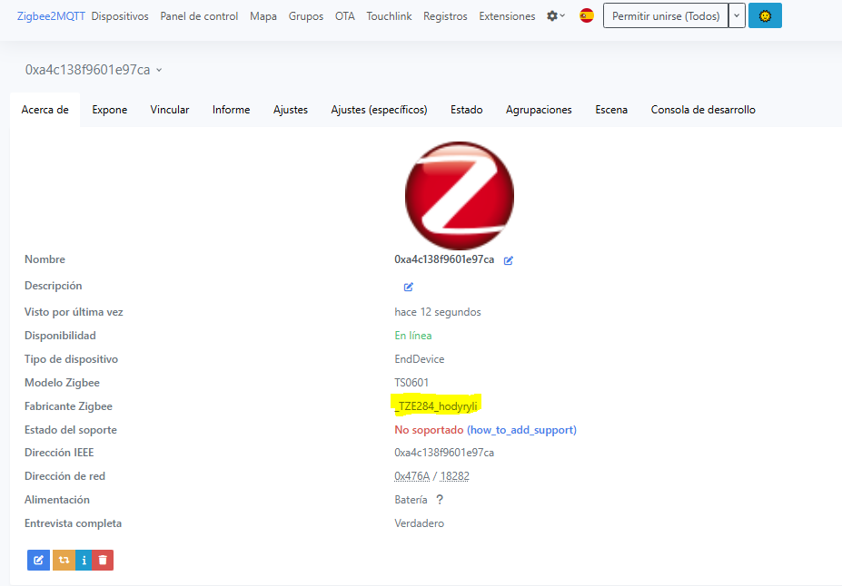 Nada mas emparejarlo nos dice que no esta soportado , y nos devuelve este identificador “_TZE284_hodyryli“